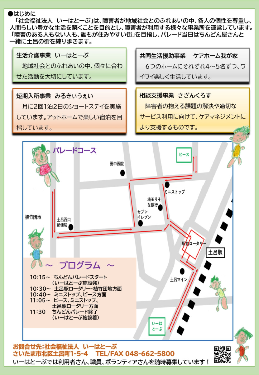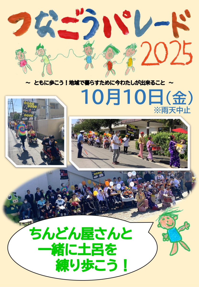 つなごうパレードのお知らせ 2025/09/22 10月10日(金)いーはとーぶ恒例のつなごうパレードを開催します。 ~ともに歩こう!地域で暮らすために今私が出来ること~ ちんどん屋さんと一緒に土呂駅周辺を練り歩きます。 2025パレードチラシPDF